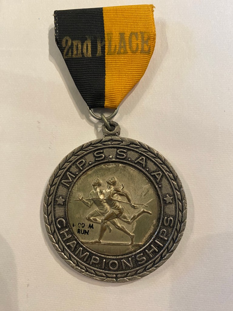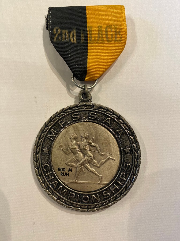 It was August and I got a phone call. I didn’t know that Coach Ron Peterman was not going to coach anymore, but our new coach, Coach Bob Cannon was going to be our new high school coach and was organizing a pre-season workout schedule. “Sure I’m ready.” And with a distance base under my belt – I hit the season running. Cross country wasn’t my strength, but I did okay. Coach Cannon was the coach who knew how to get the best out of me. He didn’t play games and when I wasn’t performing well, he let me know it. Cross Country season ended and I was team MVP – and we went into Indoor Track and I was just beginning to really hit it. I cruised through the regular season undefeated and at the State Meet took 3rd place in the 1600, my first medal at a state meet. Outdoor Spring Track was next and I hit it running hard. Coach Cannon beat me up early season and back then, I could never understand why he worked me so hard the day before a race, never taking an easy day to “rest” before a race. Now I understand it, and I use that same philosophy when I coach. What difference do these early races matter. The concern wasn’t what time I ran in March and early April, but rather, what time I could run in mid or late May. Often, I’d be at the starting line a little leg weary. But it paid off. I ran the same 3 races every meet. Lead leg on the 4×800 relay, 1600 and 800. At the time, the two 800s were mere after thoughts, or so I thought. As the season went on, I learned a lot about racing and strategy. I learned about pace and how to hit my marks. State Meet and I am rolling. I am now at the starting line with many of the same guys I watched last year and it was a bit surreal. Gun went off and I hit my first lap right on my time I wanted. Last lap and I was in position to medal. Had a good last lap and a strong finish, but couldn’t catch the guy who won, and I finished 2nd with a 4:23.0. Still my high school and Wicomico County Maryland record. I’ve run faster miles since and my senior year didn’t have the results I wanted (many factors) and I will always hold this race as testament that once I set my mind to something I can accomplish anything. I hadn’t seen this medal in many many years until seeing it in that box and it always reminds me of that moment when I told myself, “I wanna be good”. That’s medal #1.